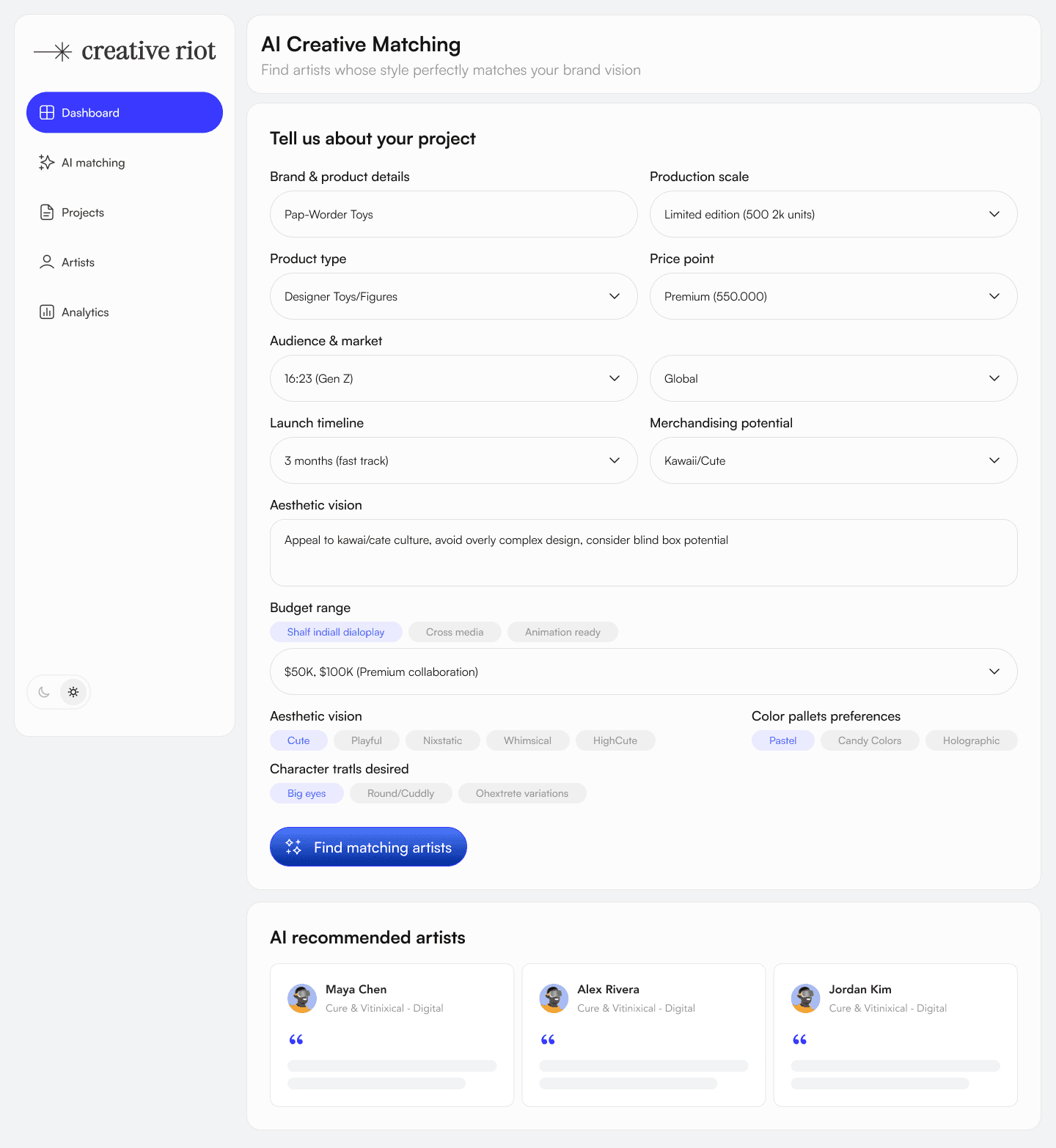 Our AI analyzes your brand identity, target audience, and aesthetic preferences against our database of 10,000+ artists. It considers visual style, cultural trends, audience demographics, and past collaboration success rates to recommend artists with 94% compatibility accuracy.